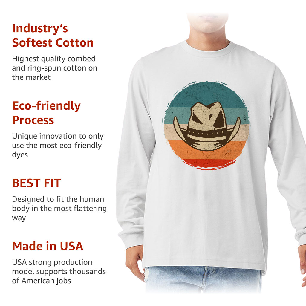 Cowboy Hat Long Sleeve T-Shirt is proudly made with 7x less water than average manufacturers, in recycle-friendly facilities that also guarantee zero sweatshop conditions. Retro Long Sleeve T-Shirt is designed and printed in California.