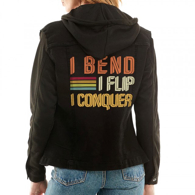 Eat Sleep Gymnastics Repeat Ladies’ Denim Jacket with Fleece Hoodie – Retro Design Women’s Denim Jacket – Printed Denim Jacket