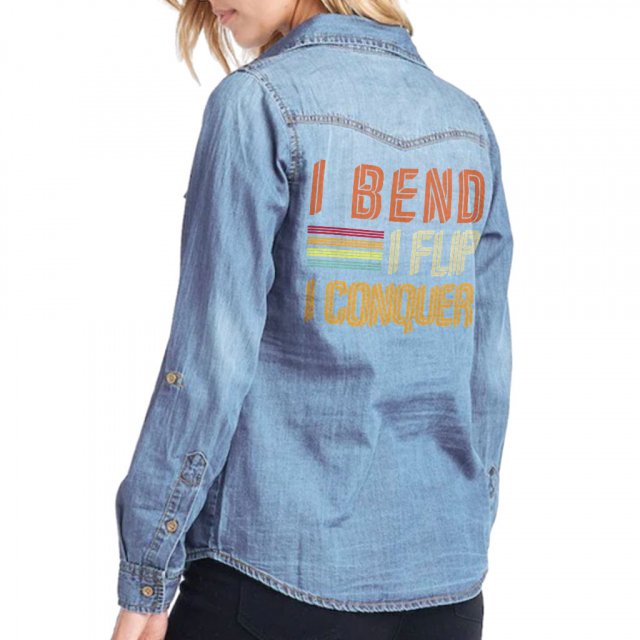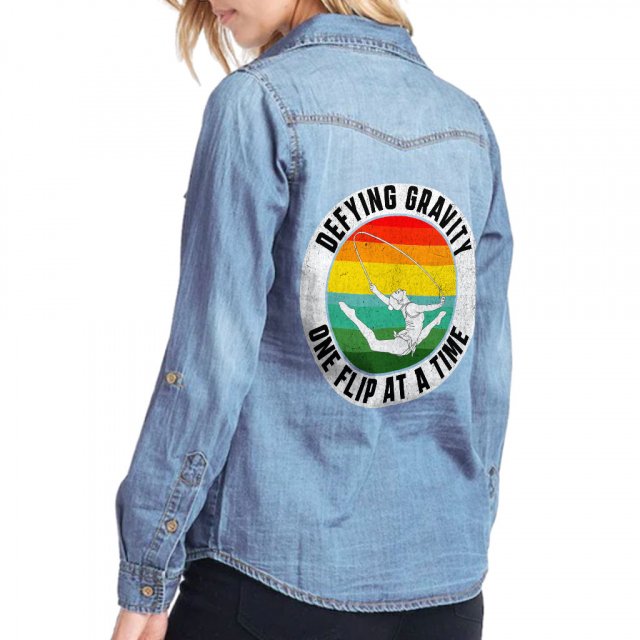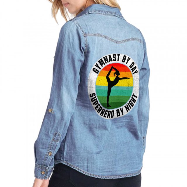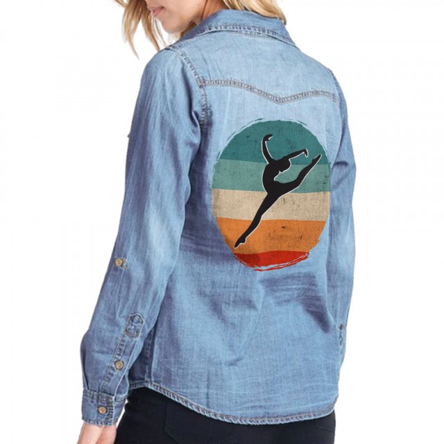 Eat Sleep Gymnastics Repeat Women’s Long Sleeve Denim Shirt – Retro Design Ladies Denim Shirt – Printed Denim Shirt