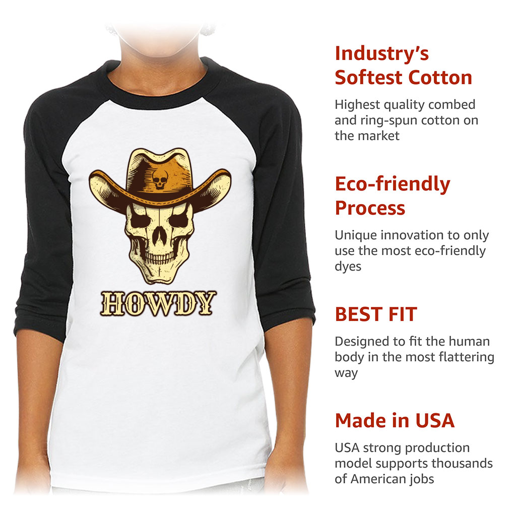 Howdy Cowboy Kids’ Baseball T-Shirt – Skull 3/4 Sleeve T-Shirt – Cool Design Baseball Tee